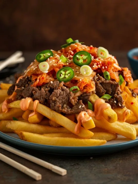 Discover the ultimate Korean loaded fries recipe! Crispy fries topped with bulgogi, kimchi, and spicy gochujang mayo. Get the recipe now!